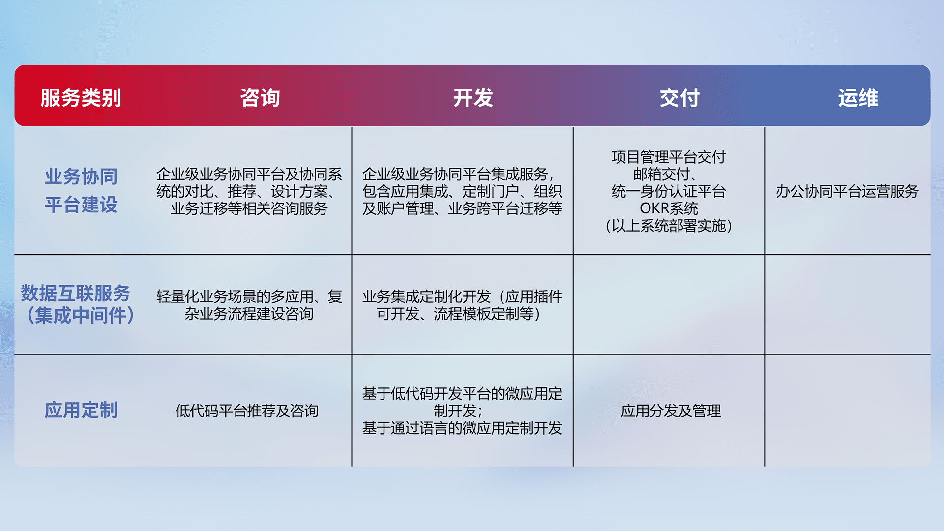 针对钉钉、、、、企微、、、IDaas等平台级产品提供产品的规划、、、、方案、、、、交付、、、定制化开发等服务,,,实现如统一协同办公、、、智能客户服务、、、、混合会议管理、、智能数据查询、、、、等业务场景,,,实现数字化转型。。。
