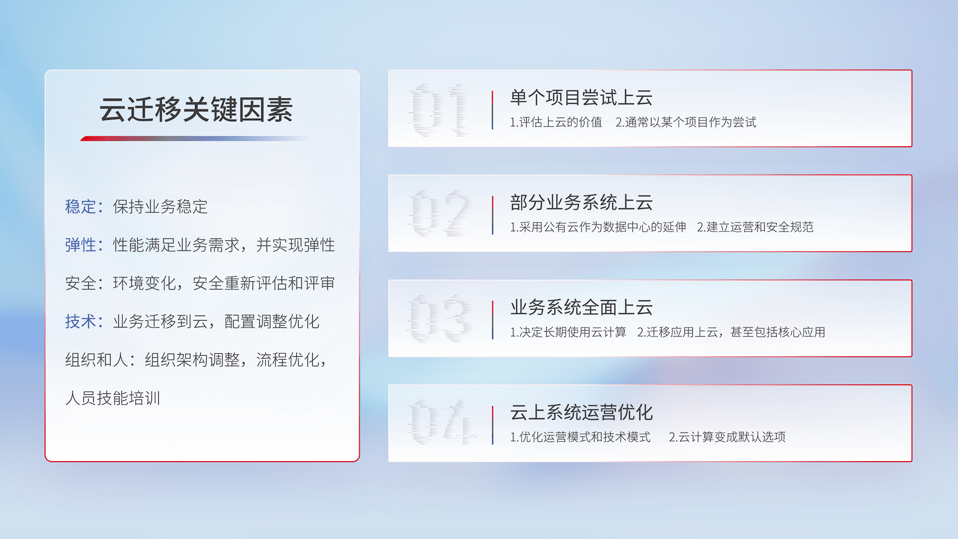 结合实际业务,,从规划设计、、云平台选型、、、云原生改造、、、数据迁移、、、集成交付,,迁移全过程为客户识别最佳上云路径,,,,做好风险识别管理,,设计网络架构、、、、身份权限、、、、安全审计合规、、、、操作审计、、、、日志审计、、监控告警策略、、多站点容灾设计等,,,对云上基础设施进行整体规划,,,,提升IT治理水平,,以满足弹性、、、高可用、、高性能的需求。。。。