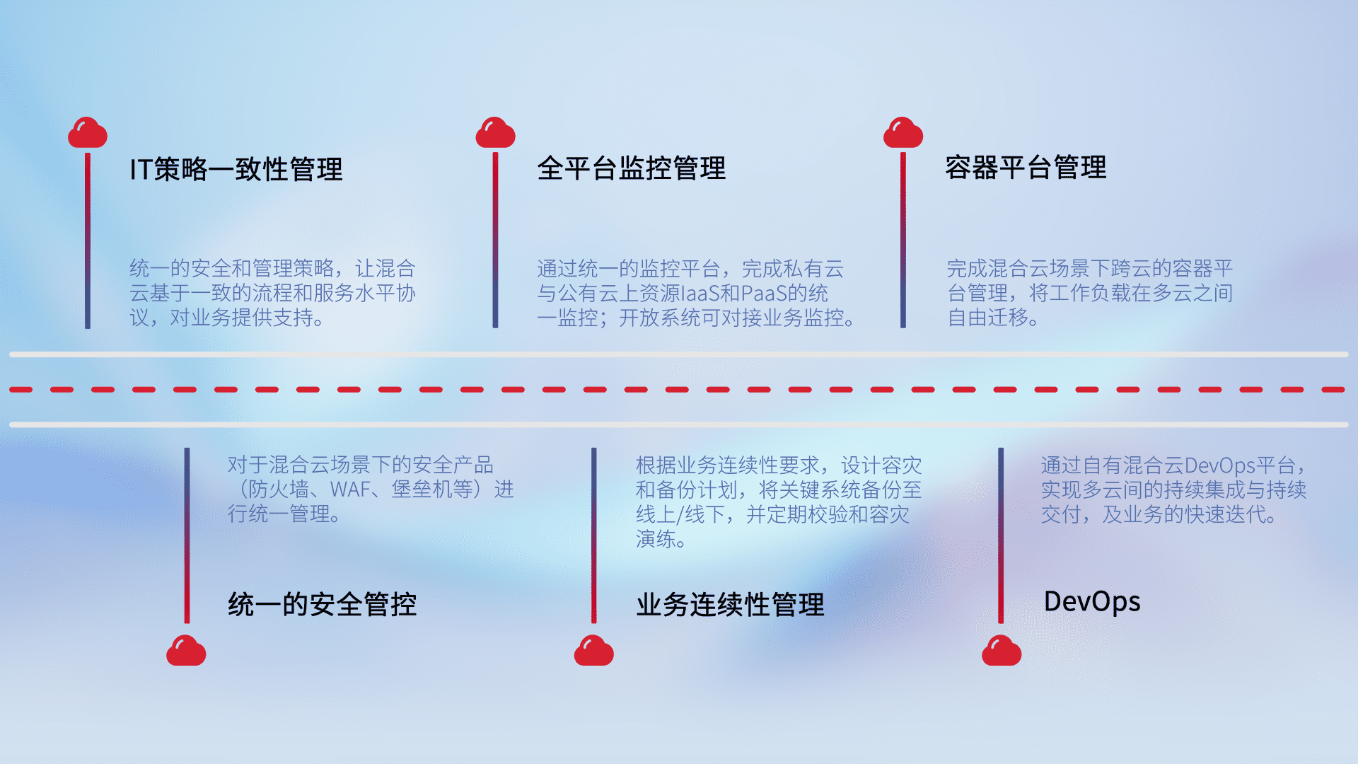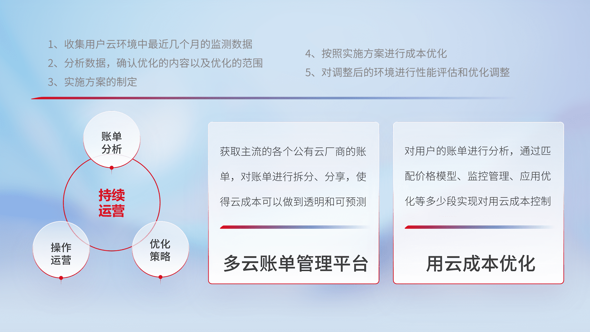 通过多云纳管,,以统一的资源数据模型把客户的云资源进行抽象和封装,,进而实现对多云资源的统一操作,,,,保障云资源管理的可靠性、、、稳定性与可用性。。量身定制化运维内容,,配置、、、、开发运维、、补丁管理、、、备份、、、监控、、、认证和访问管理、、、审计和日常巡检等,,,保障在用云过程中的可靠度,,,稳定度以及高可用率。。