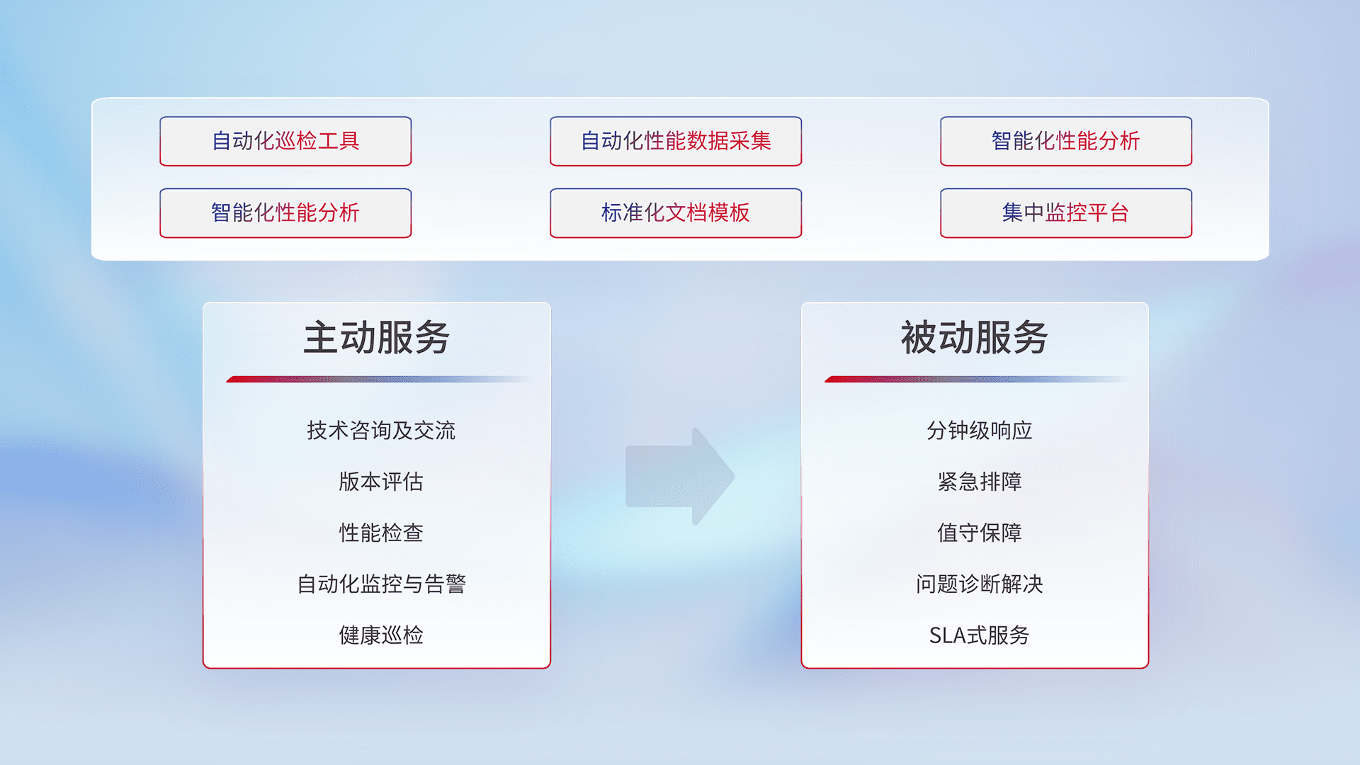 智能化工具和标准化文档,,保障服务质量,,,,提供主动服务(包含技术咨询、、、、版本评估、、、性能检查、、、、自动化监控与告警、、健康巡检)和被动服务包含(分钟级响应、、紧急排障、、值守保障、、问题诊断解决、、、、SLA服务)。。