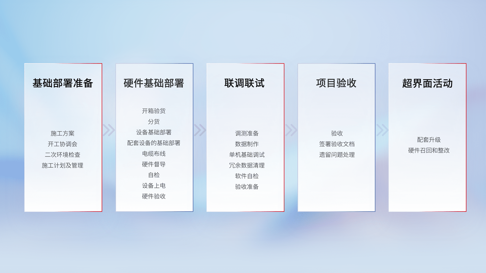 从基础部署准备、、、硬件基础部署、、、联调联试、、、、项目验收、、越界面活动的全过程可追溯,,,保证施工质量和进度。。。。